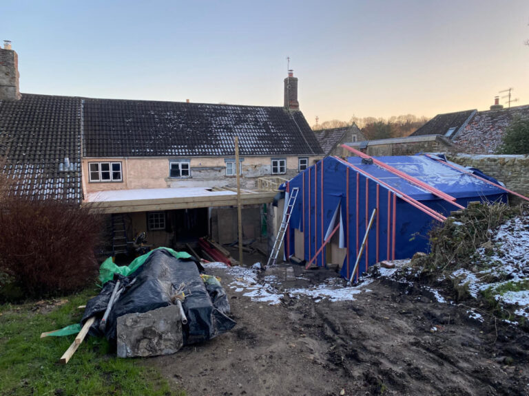 New Extension, Bruton. After some tricky groundworks and stone wall repairs in very wet and chilly conditions, it’s so good to see the new extensions taking shape.