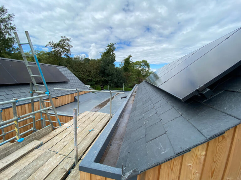 New Dwelling, Westcombe. Roof and solar panels installed. Final checks before the scaffolding is taken down.